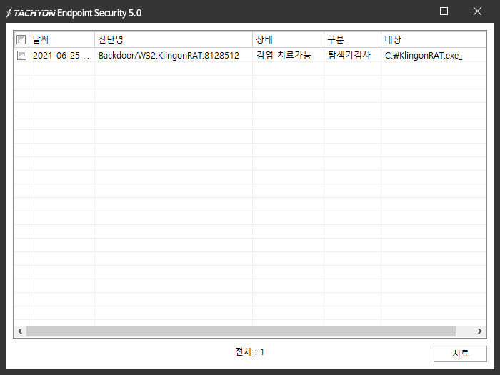 상기 악성코드는 잉카인터넷 안티바이러스 제품 TACHYON Internet Security 5.0에서 진단 및 치료가 가능하다.