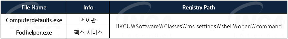"MakeAdmin" 루틴에서 [표 2]와 같은 권한이 높은 정상 프로그램의 레지스트리 변조를 통해 실행과 동시에 권한이 높은 자식 프로세스로 악성코드도 함께 실행되도록 한다.