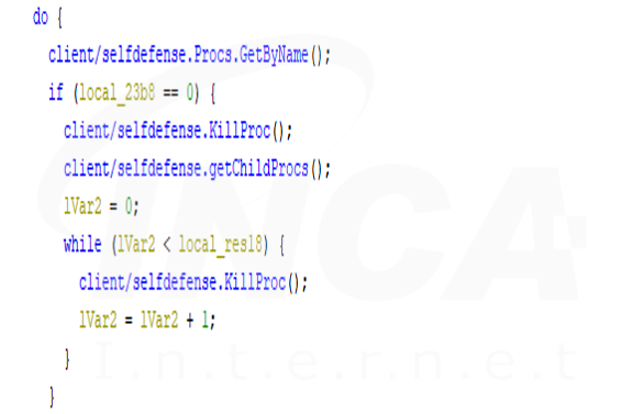 "Klingon RAT"은 명령 프롬프트를 실행시켜 "WMIC" 명령어(getCaption, ParentProcessID, ProcessID)를 이용해 실행중인 모든 프로세스를 검색한다. 그 후, 공격자 서버에 저장된 백신 프로그램 파일명과 비교하여 일치하면 종료를 시도한다.