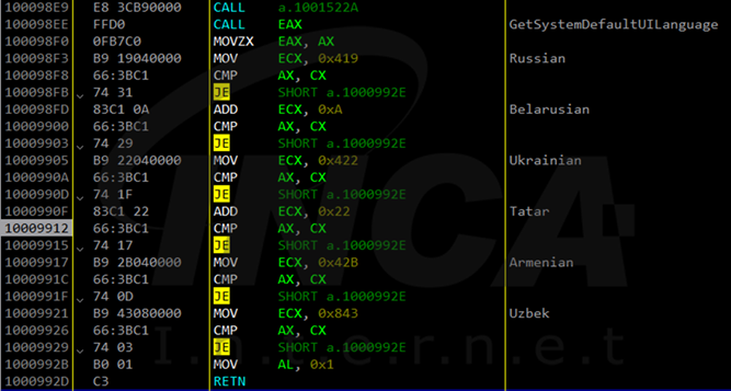 아래의 그림과 같이 시스템 언어를 획득하여 Russian, Belarusian, Ukrainian, Tatar, Armenia 또는 Uzbek 언어를 사용하는 경우, 프로세스를 종료하여 악성 동작이 중단된다.