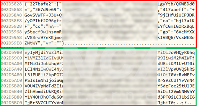 1차 난독화한 데이터(빨간색 상자)를 포맷에 맞게 수집하여, base64로 2차 난독화(초록색 상자)를 진행한다.