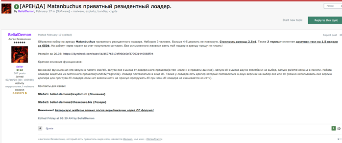 한 해킹 포럼에서 처음 광고되었으며 $2500 달러에 판매가 되었다. 해당 게시글을 작성한 BelialDemon은 이전에TriumphLoader를 개발하여 판매한 것으로 추정된다.