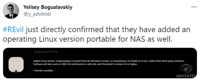 REvil 랜섬웨어 운영진은 러시아어를 사용하는 포럼에 NAS 서버에서 실행 가능한 REvil 랜섬웨어의 Linux 변종을 출시했다고 알렸다.