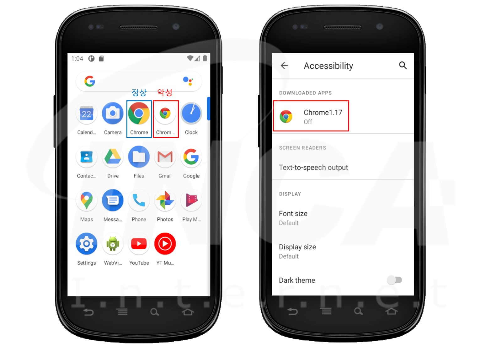 앞서, 살펴본 내용과 같이 악성코드 제작자들은 사용자가 정상 프로그램인지 악성 앱인지 구분하기 쉽지 않도록 정상 아이콘과 유사한 아이콘으로 위장한다.