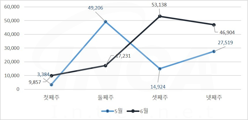 6월 한달 동안 악성코드 진단 현황을 주 단위로 살펴보았을 때 5월에 비해 증가한 추이를 보이고 있다.