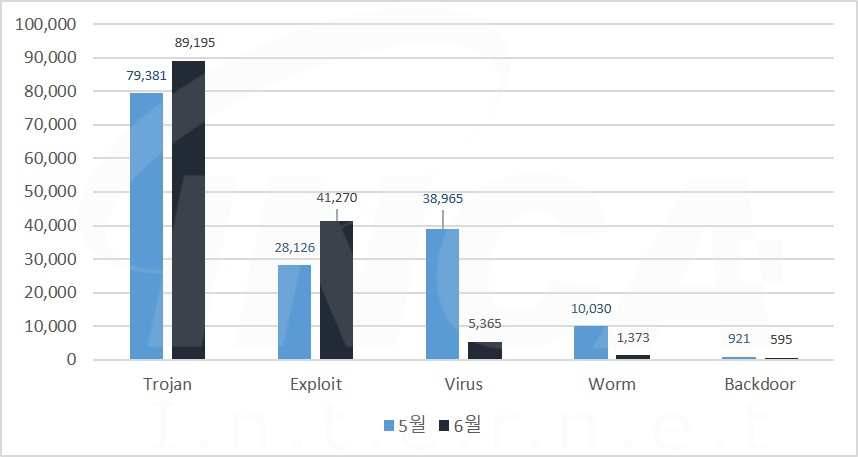 6월에는 악성코드 유형별로 5월과 비교하였을 때 Trojan, Exploit의 진단 수가 증가하였고, Virus, Worm 및 Backdoor의 진단 수가 감소하였다.