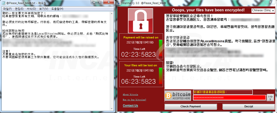 파일명에 “wannacry” 확장자를 추가하고 “@Pleas_Read_Me@.txt”라는 랜섬노트를 생성하는 “WannaCry” 랜섬웨어의 변종이 발견됐다. 해당 랜섬웨어는 바탕 화면 배경을 변경한다.