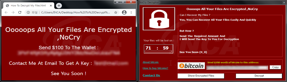 파일명에 “.Cry” 확장자를 추가하고 “How To Decrypt My Files.html”이라는 랜섬노트를 생성하는 “NoCry” 랜섬웨어의 변종이 발견됐다.