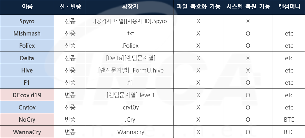 잉카인터넷 대응팀은 2021년 6월 25일부터 2021년 7월 1일까지 랜섬웨어 신•변종 및 이슈와 관련하여 대응을 진행하였으며, 신종 랜섬웨어는 “Spyro” 외 6건, 변종 랜섬웨어는 “WannaCry” 외 2건이 발견됐다.