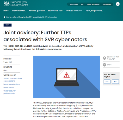 지난 5월 초, 미국 국가안보국 (NSA), 연방 수사국 (FBI) 및 사이버 보안 및 인프라 보안국 (CISA)에서는 공동 자문서를 통해 작년 발생한 SolarWinds 공격에 CozyBear 해커그룹의 배후인 SVR의 책임이 있다고 발표하였다.