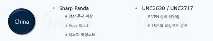 중국 정부의 후원을 받는 것으로 알려진 해커 그룹들은 특정 국가 혹은 기업의 정보를 탈취하기 위해 악성 문서가 첨부된 피싱 메일이나 장비의 취약점을 이용하여 악성 행위를 수행하였다.
