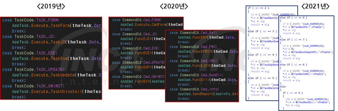 다음은 [표 1]에 작성한 명령어의 코드이다. 최근 발견한 샘플은 기존에 사용하던 .NET이 아닌 C++ 언어를 사용했기에 코드 구성의 차이를 보인다.