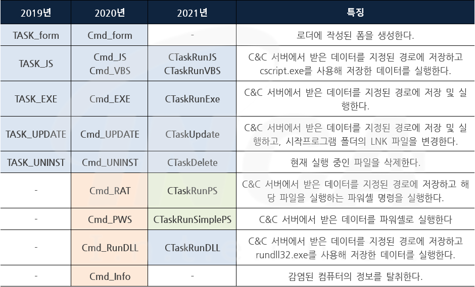 [표 1]은 “JSSLoader”가 사용하는 명령어를 2019년부터 각 해마다 정리한 표이다. 2020년에 등장한 “JSSLoader”는 2019년도에 발견한 샘플에서 사용하던 5개의 명령어 외에 “Cmd_RAT”, “Cmd_PWS” 등의 명령어를 추가해 최종 10개의 명령어를 사용했다.