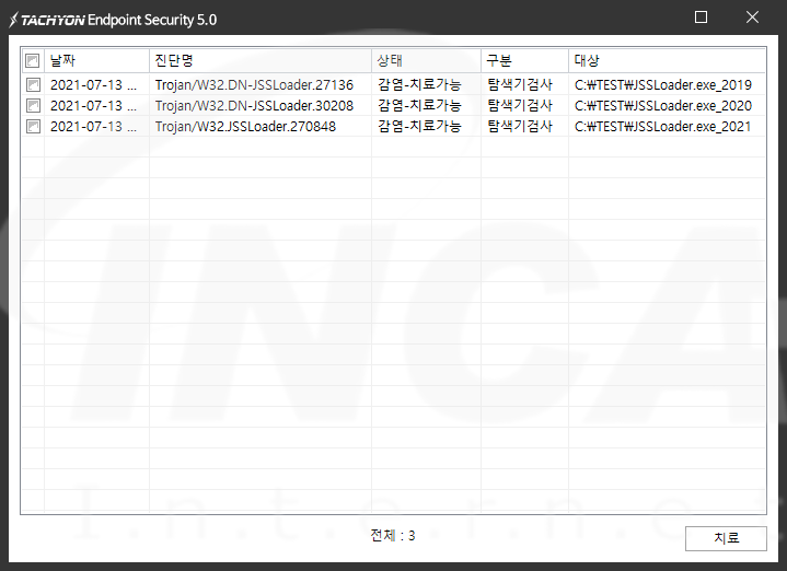 상기 악성코드는 잉카인터넷 안티바이러스 제품 TACHYON Internet Security 5.0에서 진단 및 치료가 가능하다.