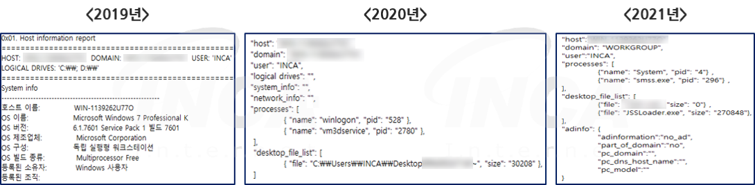 해당 악성코드는 명령어 수행 외에 감염된 PC의 정보를 수집해 공격자에게 전송한다. 기존에는 수집한 정보를 단순히 나열했다면, 2020년부터는 데이터 전달을 위한 포맷인 JSON(JavaScript Object Notation)을 사용해 데이터 조작을 조금 더 쉽게 했다.