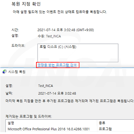 "복원 지점"을 선택하면 다음과 같이 "시스템 복원" 시 영향을 받는 프로그램 정보를 확인할 수 있다.
