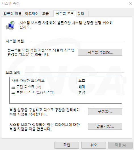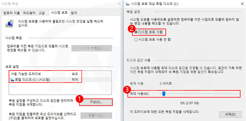 시스템 보호 화면에서 구성 버튼을 눌러 다음 [그림 2]과 같이 "시스템 보호"를 설정한다.