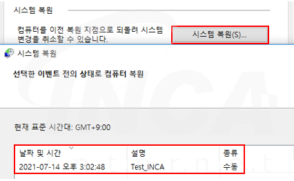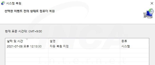 "시스템 복원"을 하기 위해 시스템 속성 창을 실행한 뒤, "시스템 복원" 버튼을 눌러 복원하려는 "복원 지점"을 선택한다.