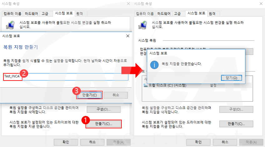 "시스템 보호"를 설정하기 위해서는 "시작 → 제어판 → 시스템 및 보안 → 시스템 → 시스템 보호" 순서로 접근하여 시스템 속성 창을 실행한다.