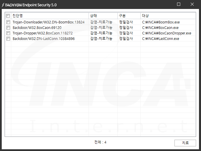 상기 악성코드는 잉카인터넷 안티바이러스 제품 TACHYON Internet Security 5.0에서 진단 및 치료가 가능하다.