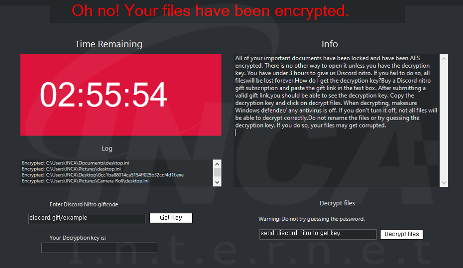 파일명에 ”.givemenitro” 확장자를 추가하고 [그림 19]의 랜섬노트를 띄우는 "Nitro" 랜섬웨어가 발견됐다. 해당 랜섬웨어는 Discord Nitro 서비스 코드를 요구하고, 감염된 사용자의 Discord 토큰을 탈취한다.