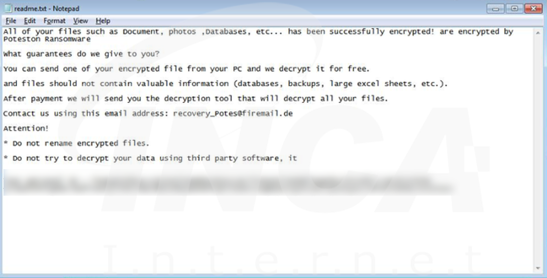 파일명에 “.poteston” 확장자를 추가하고 “readme.txt”라는 랜섬노트를 생성하는 “Poteston” 랜섬웨어가 발견됐다. 해당 랜섬웨어는 시스템 복원을 무력화한다.