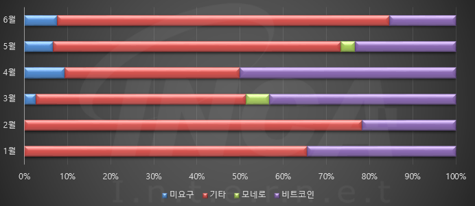2021년 상반기(1월 1일 ~ 6월 30일) 동안 월별로 랜섬웨어가 요구한 랜섬머니를 조사했을 때 주로 비트코인(BTC) 요구가 많았고, 모네로(XMR)나 랜섬머니를 요구하지 않는 경우는 매월 낮은 비율을 차지했다.