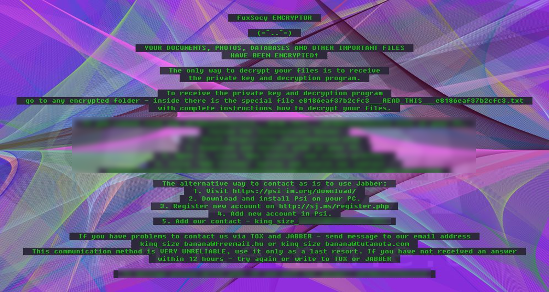 파일명에 “[랜덤 문자열].fse_[ID]“ 확장자를 추가하고 “[ID]__READ_THIS__[ID].jpg"라는 랜섬노트를 생성하는 "FuxSocy" 랜섬웨어의 변종이 발견됐다.