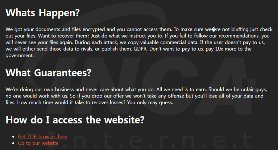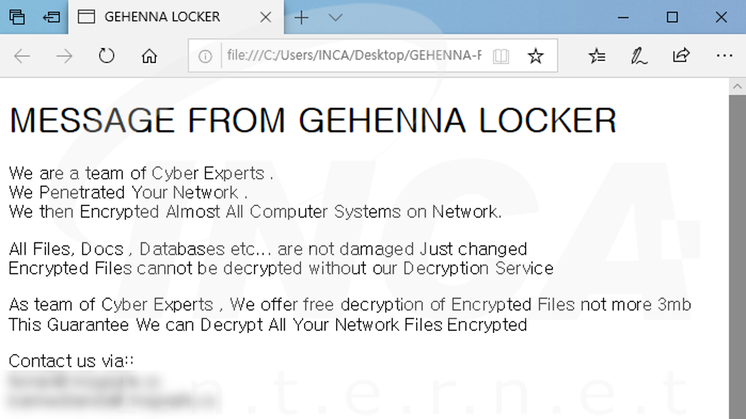 파일명에 “.gehenna” 확장자를 추가하고 "GEHENNA-README-WARNING.html"라는 랜섬노트를 생성하는 "Gehenna" 랜섬웨어가 발견됐다. 해당 랜섬웨어는 특정 프로세스의 실행을 차단하고 시스템 복원을 무력화한다.