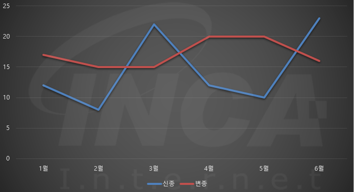2021년 상반기(1월 1일 ~ 6월 30일) 동안 잉카인터넷 대응팀은 랜섬웨어 신•변종 현황을 조사하였으며, 상반기에 발견된 신•변종 랜섬웨어의 건수는 [그림 1]과 같다. 상반기에는 월 평균 31건의 랜섬웨어가 발견됐으며 이 중, 신종과 변종 랜섬웨어는 각각 6월과 4월에 가장 많이 발견됐다.