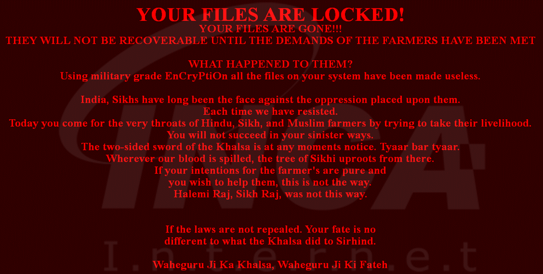 "Sarbloh" 랜섬웨어는 랜섬머니를 요구하지 않고, 인도 농업 법안 철회를 요구하는 메시지를 전하는 새로운 시위 방법으로 등장했다. 해당 랜섬웨어는 확장자를 ".sarbloh"로 바꾸고, "README_SARBLOH.txt" 라는 이름의 랜섬노트를 생성한다. 또한, 볼륨 섀도우 복사본을 삭제하여 복구를 무력화한다.