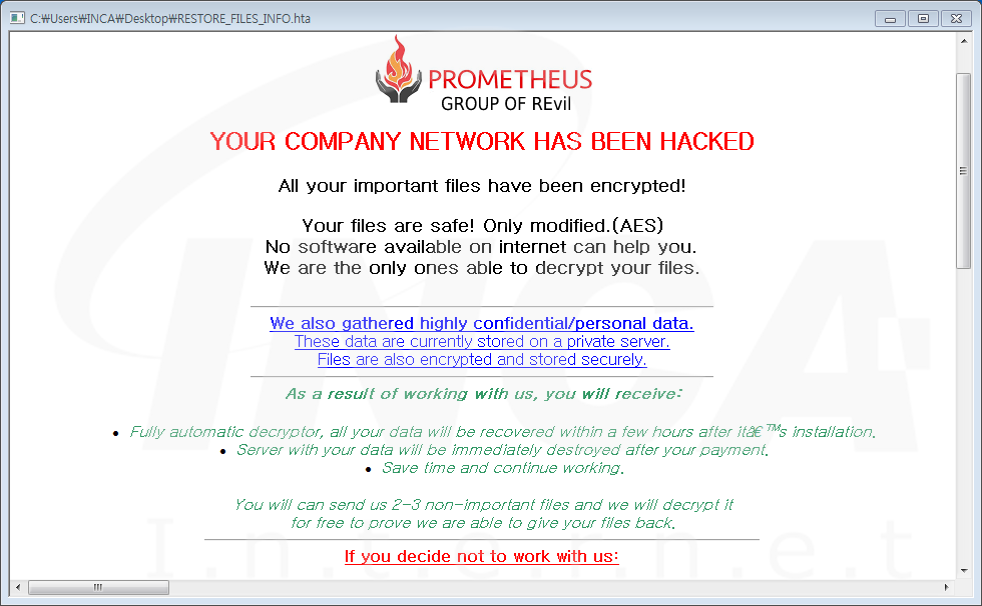 파일명에 ".[3자리 숫자 - 3자리 영문 숫자값 - 4자리 영문 숫자값]” 확장자를 추가하고 “RESTORE_FILES_INFO.hta”라는 랜섬노트를 생성하는 "Prometheus" 랜섬웨어가 발견됐다. 해당 랜섬웨어는 시스템 복원을 무력화하고 특정 서비스와 프로세스를 종료 및 차단한다.