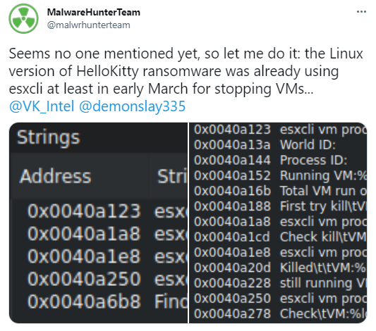 이번에 발견된 변종은 Vmware의 ESXi 플랫폼을 대상으로 만들어졌으며, 리눅스 64bit 환경에서 동작한다. 또한, ESXi의 esxcli 커맨드 라인 툴을 사용해 서버에서 실행 중인 가상 머신의 정보를 획득하고 종료한다.