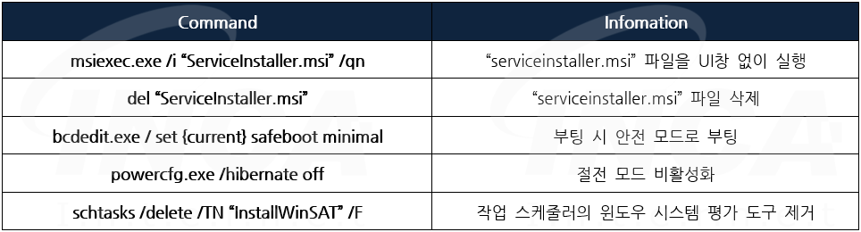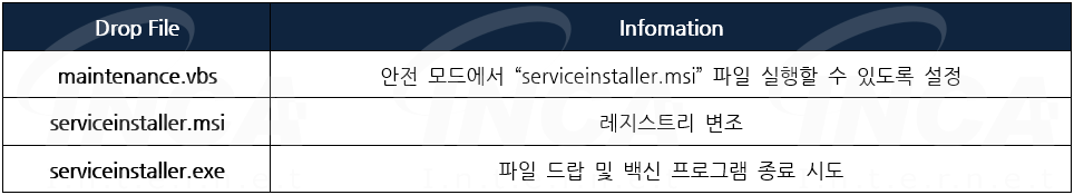 "Maintenance.vbs"는 커맨드를 통해 안전 모드에서 "serviceinstaller.msi" 파일을 실행할 수 있도록 설정한다.