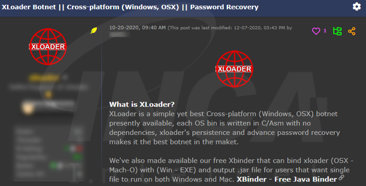 XLoader는 Windows 뿐만 아니라 MacOS 환경을 대상으로도 악성 행위를 수행하며 Windows 버전은 1개월 사용료 $59, MacOS 버전은 $49 가격으로 다크웹에서 판매되고 있다. 판매자는 Formbook의 개발자가 XLoader를 만드는데 기여 했으며, 두 악성코드가 유사한 기능을 가지고 있다고 설명하였다.