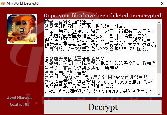 파일명에 ".MCNB" 확장자를 추가하고 "@readme@.txt"와 [그림 1]의 랜섬노트를 생성하는 "MiniWorld" 랜섬웨어가 발견됐다. 해당 랜섬웨어는 공격자의 C&C 서버와 연걸을 시도하고 바탕 화면의 배경을 변경한다.