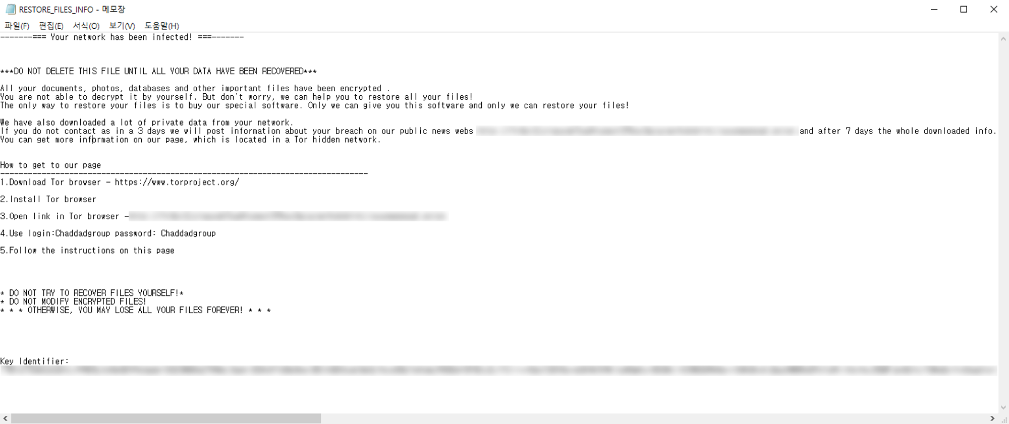 파일명에 ".chaddad" 확장자를 추가하고 "RESTORE_FILES_INFO.txt"라는 랜섬노트를 생성하는 "Chaddad" 랜섬웨어가 발견됐다. 해당 랜섬웨어는 특정 프로세스 실행 차단 및 서비스를 종료하고 시스템 복원을 무력화한다.