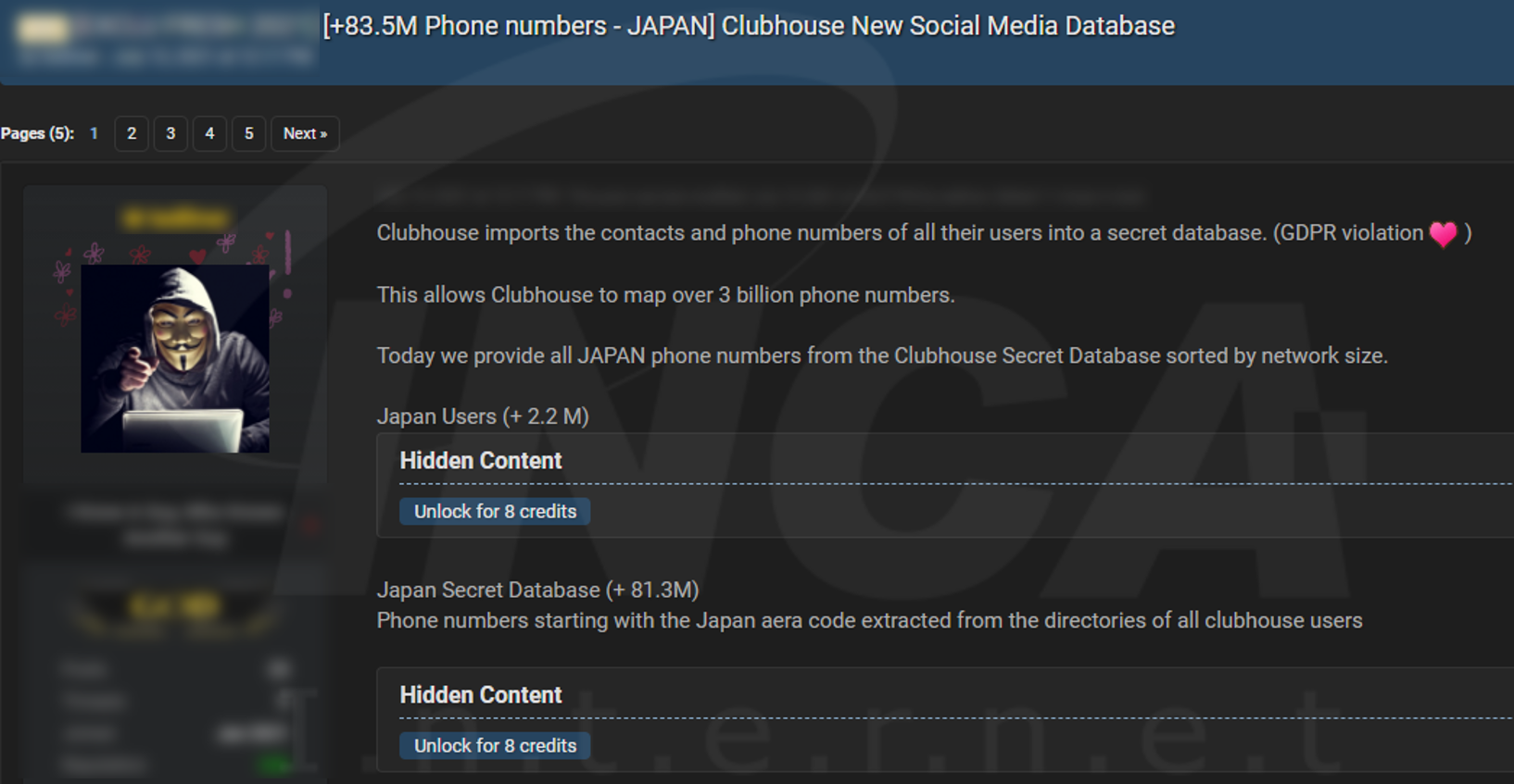 최근 Clubhouse의 데이터베이스 판매글이 해커 포럼에 게시되었다. 판매자는 전화번호가 포함된 38억개의 데이터베이스를 판매하고 있으며, 일본 사용자 약 8,350만명의 전화번호 데이터 샘플을 제공하고 있다.