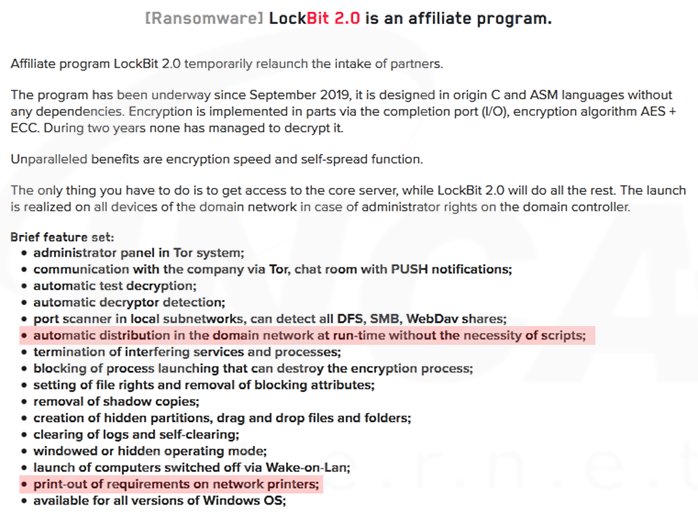 "LockBit" 측이 공개한 버전은 Active Directory 그룹 정책을 사용해 연결된 PC에 랜섬웨어를 배포할 수 있다. 또한, 네트워크와 연결된 프린터에서 랜섬노트를 출력하는 기능이 추가됐다.