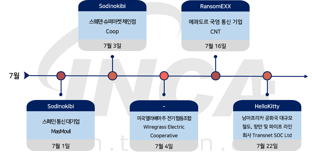 2021년 7월(7월 1일 ~ 7월 31일) 한 달간 랜섬웨어 동향을 조사한 결과, "Sodinokibi" 랜섬웨어가 스페인 통신 대기업 MasMovil과 스웨덴 슈퍼마켓 체인 기업인 Coop을 공격했으며 미국 앨라배마주 전기 협동조합인 Wiregrass Electric Cooperative가 랜섬웨어 공격을 받았다. 또한, 에콰도르의 국영 통신사 CNT와 남아프리카 공화국의 철도, 항만 및 파이프라인 회사인 Transnet SOC Ltd가 각각 "RansomEXX" 랜섬웨어와 "HelloKitty" 랜섬웨어의 공격을 받아 데이터가 유출된 사건이 있었다.