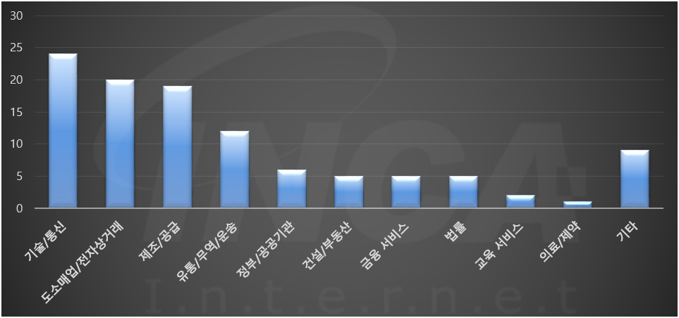 2021년 7월(7월 1일 ~ 7월 31일)에 발생한 데이터 유출 건을 산업별로 비교하였을 때 기술/통신 분야가 가장 많은 공격을 받았고, 도소매업/전자상거래 분야 및 제조/공급 분야가 그 뒤를 따랐다.