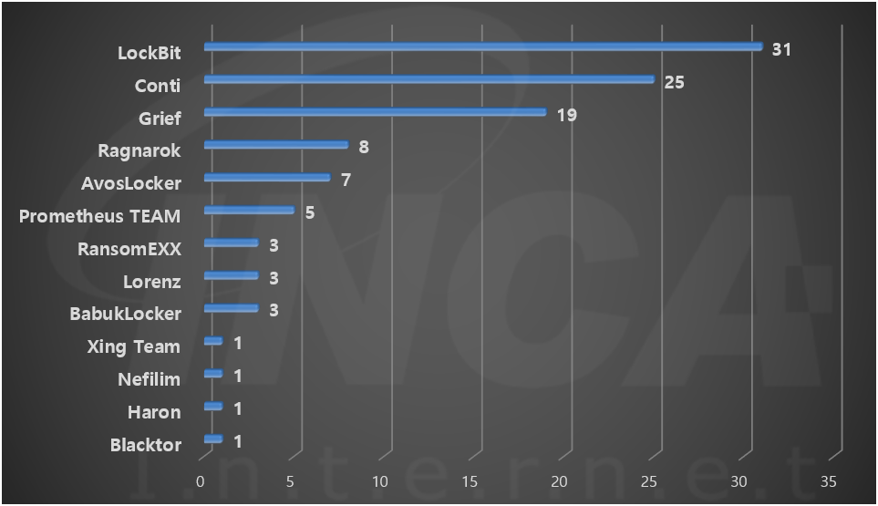 랜섬웨어 조직이 탈취한 것으로 주장하는 데이터가 게시된 데이터 유출 사이트 35곳의 정보를 취합한 결과이다.