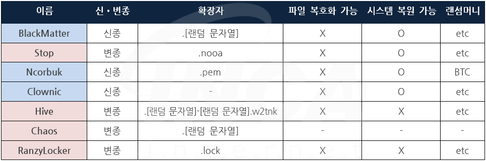 잉카인터넷 대응팀은 2021년 7월 30일부터 2021년 8월 5일까지 랜섬웨어 신•변종 및 이슈와 관련하여 대응을 진행하였으며, 신종 랜섬웨어는 "BlackMatter" 외 2건, 변종 랜섬웨어는 "Stop" 외 3건이 발견됐다.