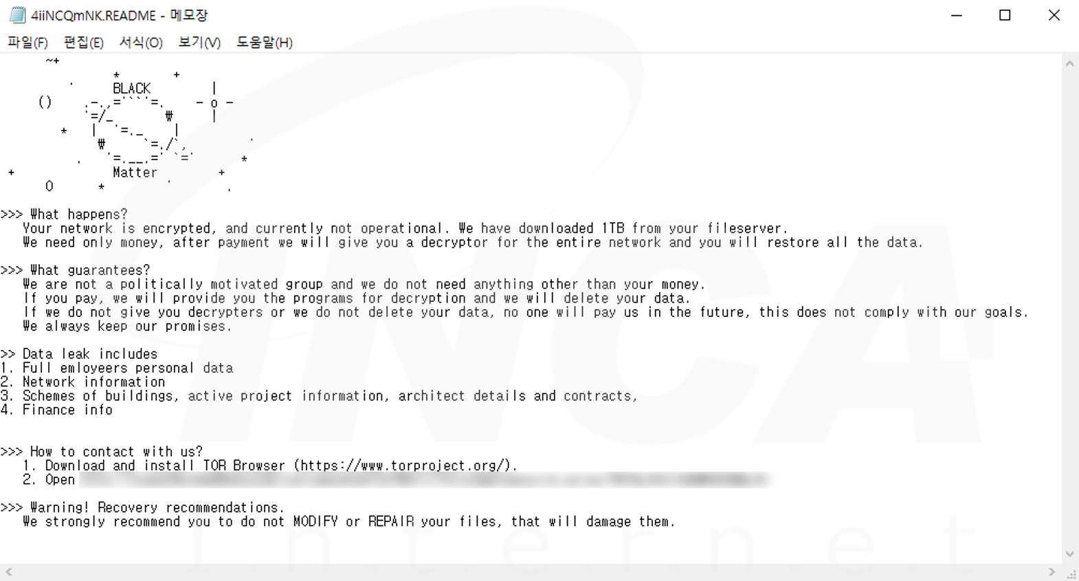 파일명에 ".[랜덤 문자열]" 확장자를 추가하고 "fwdHOW_TO_DECRYPT.txt"라는 랜섬노트를 생성하는 "BlackMatter" 랜섬웨어가 발견됐다.