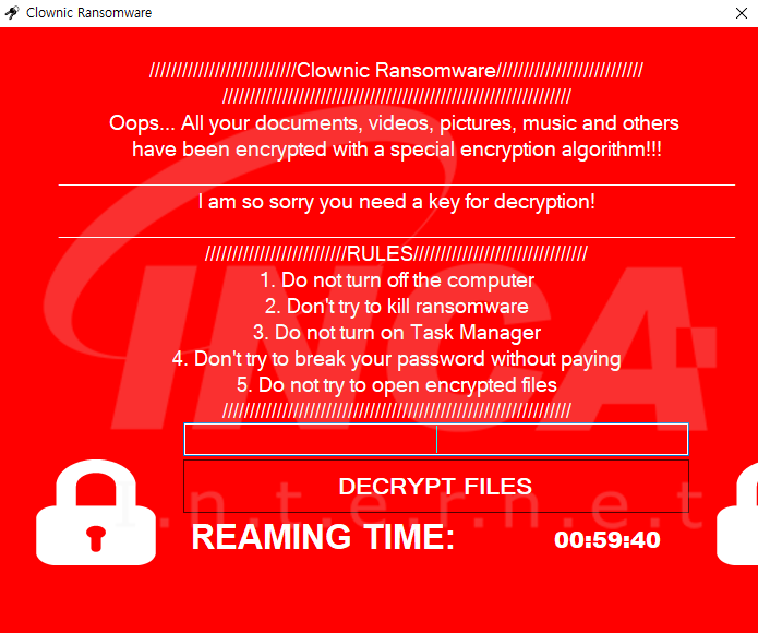 파일을 삭제하고 "ClownicRansomware1.0.txt"라는 랜섬노트를 생성하는 "Clownic" 랜섬웨어가 발견됐다. 해당 랜섬웨어는 작업 관리자 실행을 차단하고, 마우스를 사용할 수 없게 만든다.