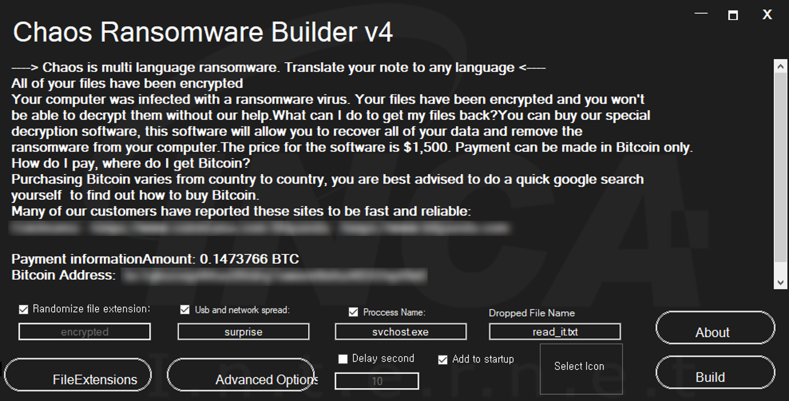 파일명에 ".[랜덤 문자열]" 확장자를 추가하고 "read_it.txt"라는 랜섬노트를 생성하는 "Chaos" 랜섬웨어 빌더의 '버전 4'가 발견됐다.