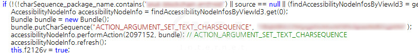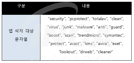 접근성 서비스 권한을 얻은 Oscorp 는 권한을 악용하여 감염된 기기를 모니터링한다. 모니터링 중 아래 문자열이 포함된 앱이 실행되면 해당 앱 삭제를 시도하며, 이는 백신 앱의 활동을 방해하기 위함으로 추정된다.