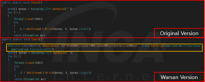 "Warsan RAT" 악성코드에 추가된 기능은 크게 두 부분이 존재하며, 다음 [그림 4]과 같이 재부팅 시 "Warsan RAT" 악성코드가 실행되도록 레지스트리에 설정하는 기능이 추가되었다.