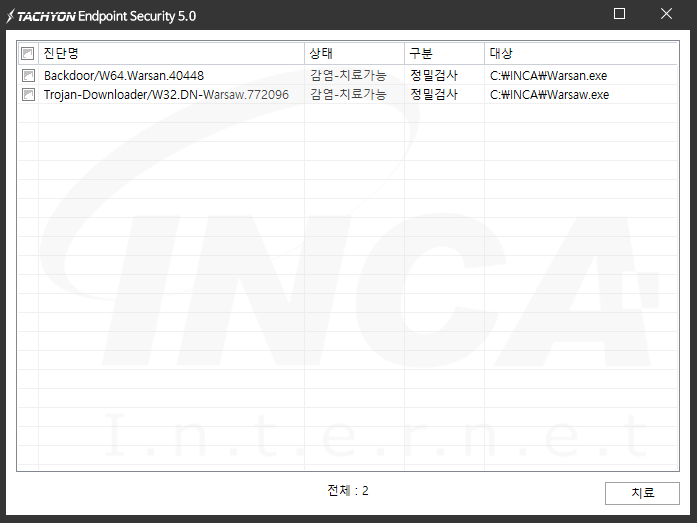 상기 악성코드는 잉카인터넷 안티바이러스 제품 TACHYON Internet Security 5.0에서 진단 및 치료가 가능하다.